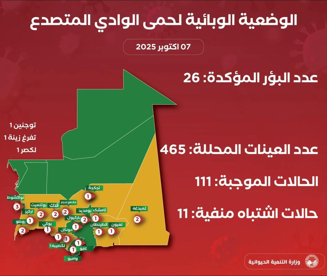أعلنت وزارة التنمية الحيوانية ارتفاع عدد البؤر الحاضنة لحمى الوادي المتصدع إلى 26 بؤرة موزعة على 20 مقاطعة تتبع لعشر ولايات.