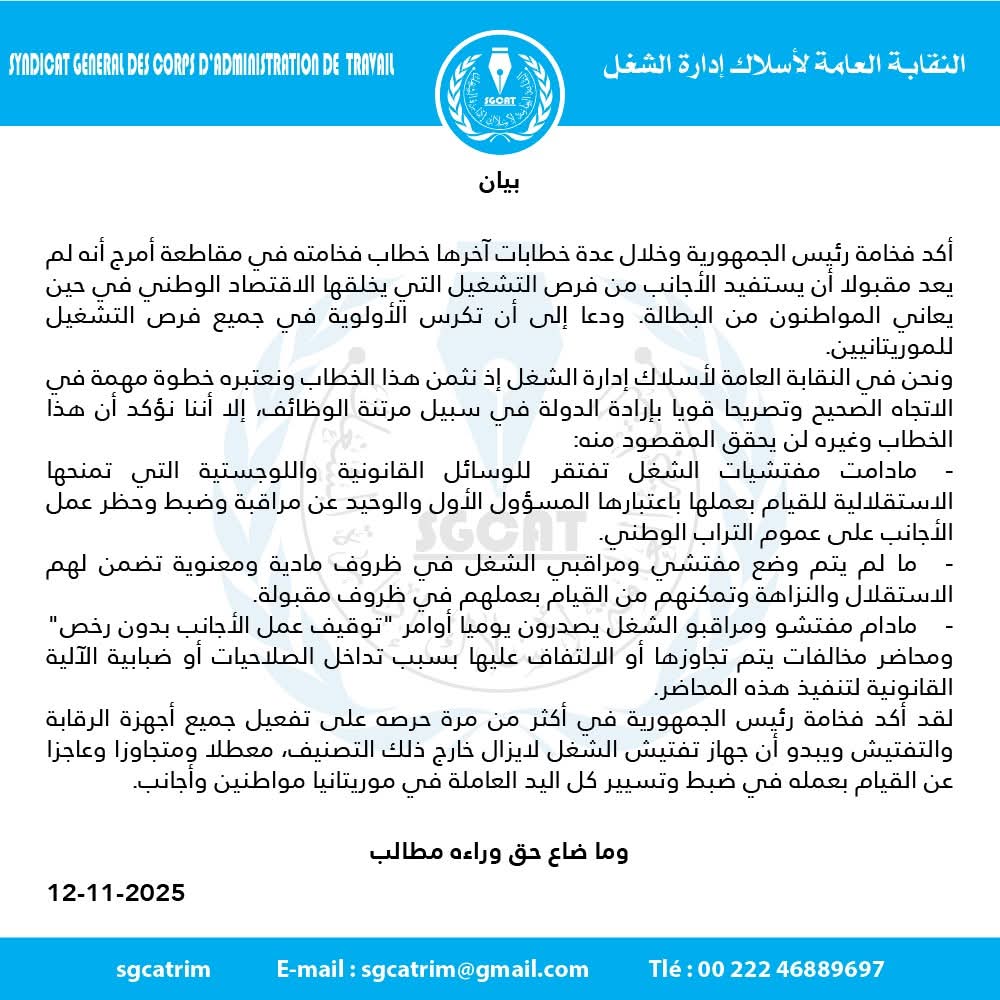 وتساءل رئيس الجمهورية عن أسباب ضعف الاستثمار في الزراعة والثروة الحيوانية رغم توفر الموارد، مبرزا أن العديد من فرص العمل في قطاعات البناء والصيد والزراعة يشغلها عمال أجانب، في حين يمكن للشباب الموريتاني الاستفادة منها.
