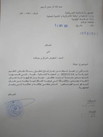 أمر حاكم مقاطعة عرفات بنواكشوط الجنوبية، المفوض المركزي للشرطة بالمقاطعة بفتح تحقيق في مزاعم اعتداء أحد وكلاء التلاميذ على مدير مدرسة آب ولد اخطور.
