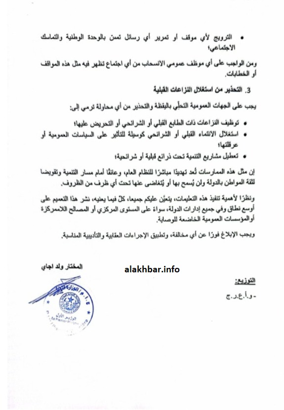 وأكد ولد اجاي في التعميم الصادر عنه أنه يتعين على موظفي الدولة ووكلائها الالتزام بالتعليمات المتعلقة بحظر الاجتماعات ذات الطابع الطائفي أو القبلي أو الجهوي، مشددا على أنه يجب عليهم الامتناع عن المشاركة في أي اجتماع أو تجمع أو نشاط ذي طابع طائفي أو قبلي أو جهوي، والانسحاب فورا من أي اجتماع ظهرت محاولات استغلاله كمنصة لذلك.