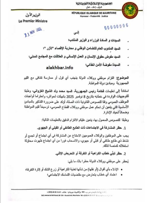 وأوضح الوزير الأول لأعضاء الحكومة ومن في رتبتهم أن هذا التعميم جاء استنادا إلى تعليمات الرئيس محمد ولد الغزواني، وطبقا للتوجيهات الواردة في خطابه في انبيكت الأحواش، واحتراما لواجبات الموظف العمومي وفقا للنصوص القانونية.