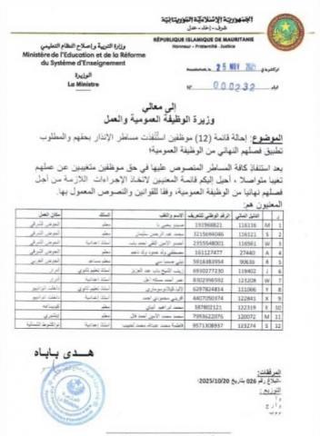 أحالت وزارة التربية وإصلاح نظام التعليم أسماء 12 مدرسا إلى وزارة الوظيفية العمومية لاتخاذ الإجراءات بفصلهم نهائيا من وظائهم.