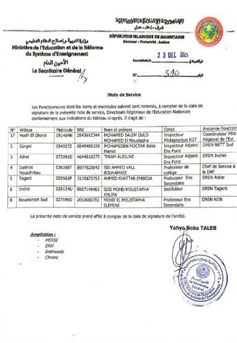 - مديرا للتربية في ولاية داخلت نواذيبو: سيدي أحمد فال بو حمادي،