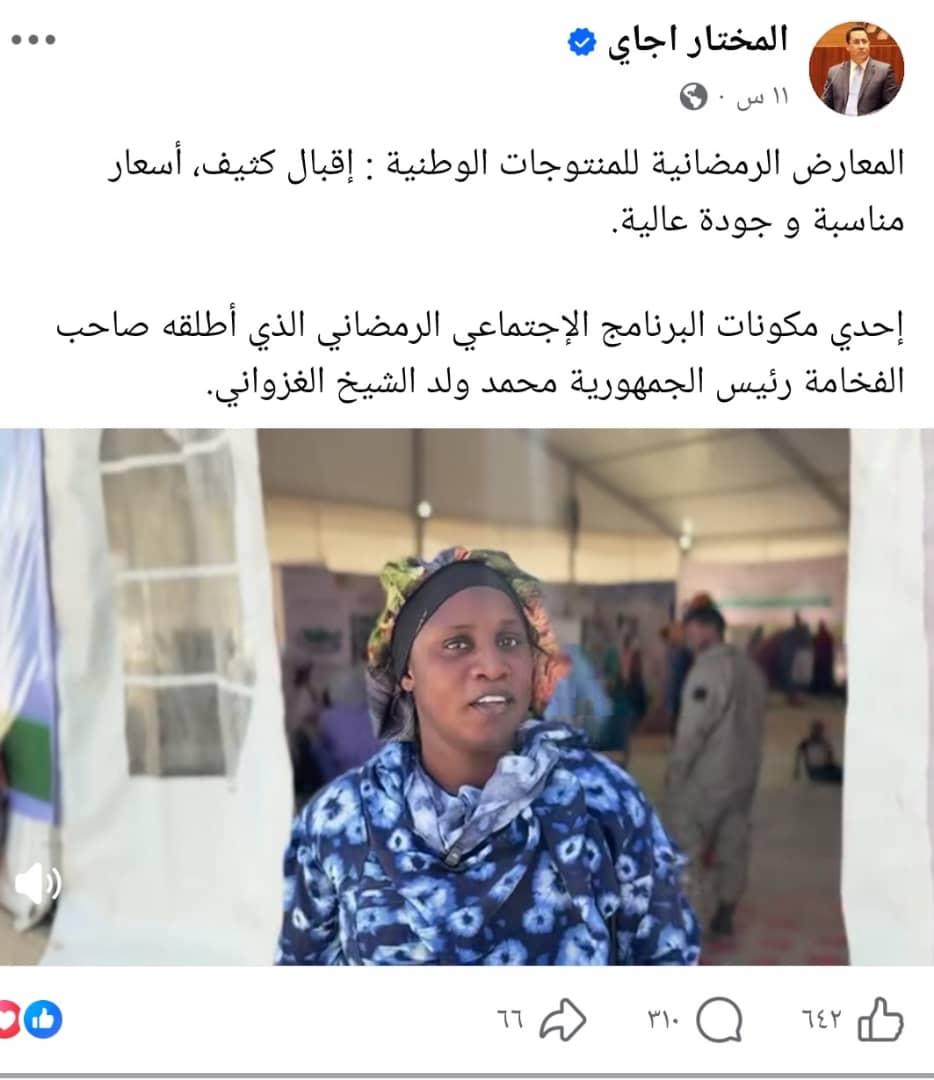 وأضاف ولد اجاي في تدوينة له على الفيس بوك أن هذه المعارض تعتبر "إحدي مكونات البرنامج الاجتماعي الرمضاني الذي أطلقه صاحب الفخامة رئيس الجمهورية محمد ولد الشيخ الغزواني".