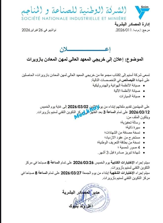 أعلنت الشركة الوطنية للصناعة والمناجم (سنيم) عن تنظيم مسابقة اكتتاب موجهة لخريجي المعهد العالي لمهن المعادن بمدينة الزويرات، بهدف دعم مواردها البشرية في التخصصات الفنية.