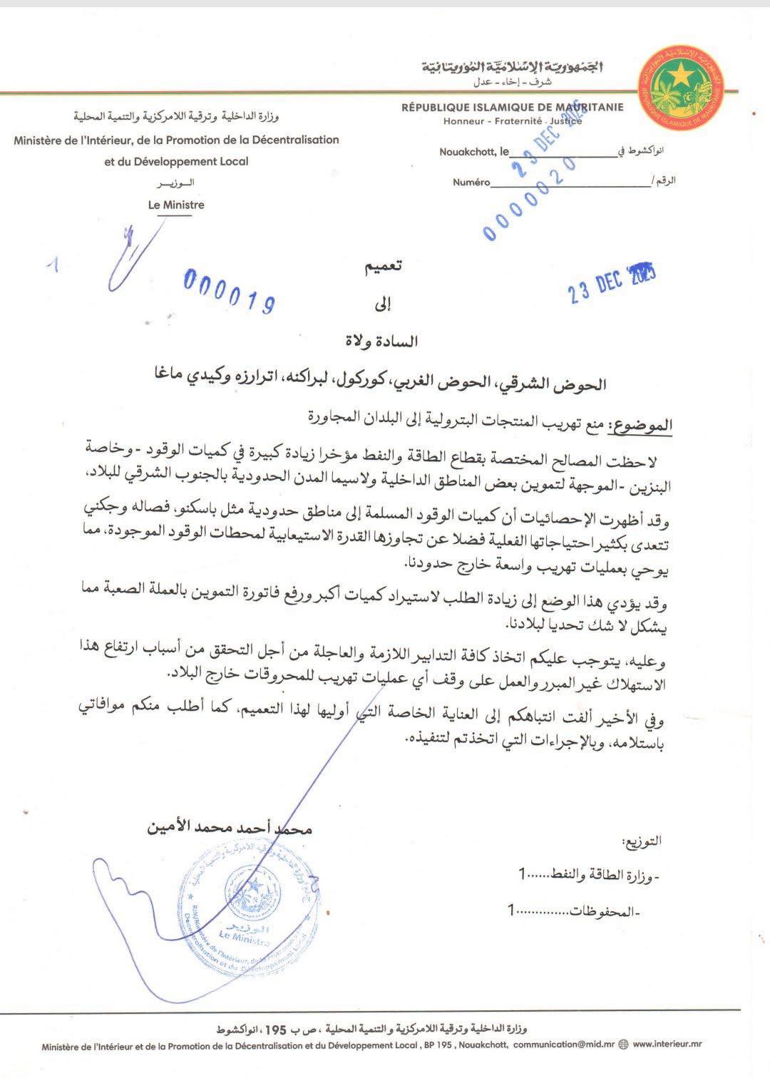 أمر وزير الداخلية وترقية اللا مركزية والتنمية المحلية محمد أحمد ولد محمد الأمين ولاة الولايات الجنوبية والشرقية من البلاد باتخاذ الإجراءات الكفيلة بوقف أيّ تهريب للوقود إلى البلدان المجاورة.
