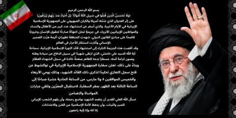 وقد أفضت هذه الجريمة النكراء إلى استشهاد قائد الثورة الإسلامية الإيرانية، سماحة آية الله السيد علي خامنئي، الذي ارتقى شهيدًا في سبيل الدفاع عن سيادة وطنه وصون كرامة أمته، مسطرًا بدمه الطاهر صفحةً خالدة في سجل الشهداء العظام.