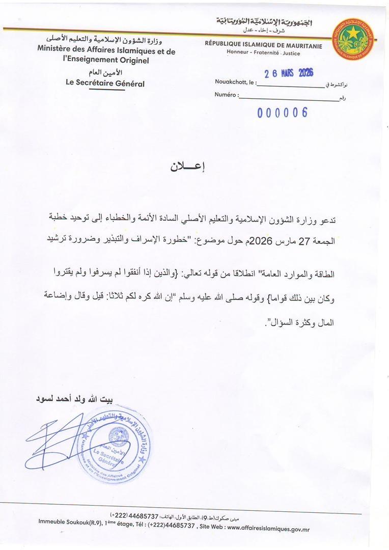 دعت وزارة الشؤون الإسلامية والتعليم الأصلي الأئمة والخطباء إلى توحيد خطبة الجمعة حول موضوع “خطورة الإسراف والتبذير وضرورة ترشيد الطاقة والموارد العامة”.
