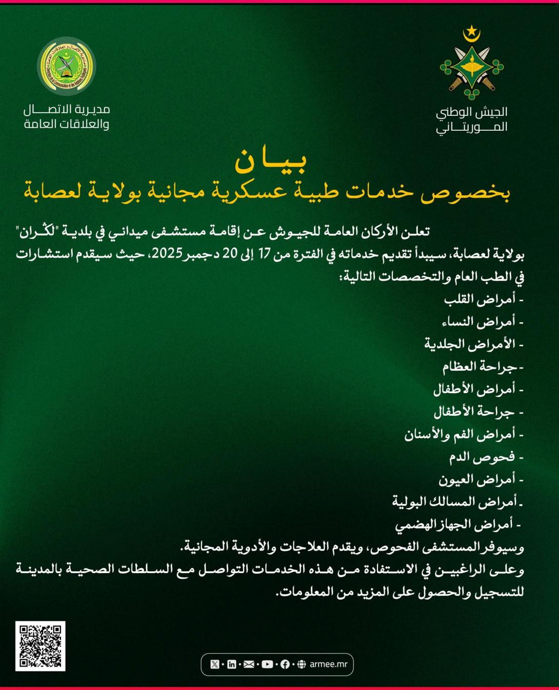 أعلنت الأركان العامة للجيوش القيام بنشاطات عسكرية من بينها عملية إتلاف مواد متفجرة، ابتداء من يوم الإثنين 15 دجمبر 2025، على مستوى حقل رماية أكريدل 70 كلم شمال شرق نواكشوط.