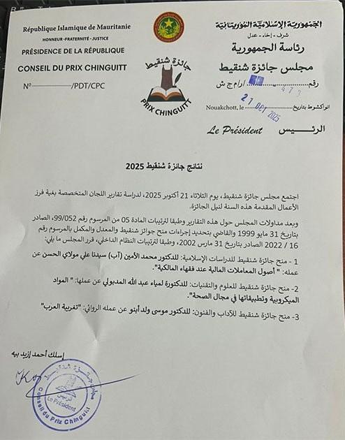 أعلن مجلس جائزة شنقيط اليوم الأربعاء أسماء الفائزين بالجائزة لسنة 2025.