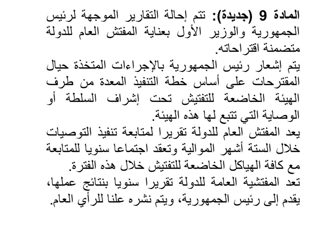 أما الفقرة الأولى من المادة 9، فقد أكدت على ضرورة إحالة التقارير الموجهة إلى الرئيس والوزير الأول بعناية المفتش العام للدولة، متضمنة اقتراحاته، مع إشعار رئيس الجمهورية بالإجراءات المتخذة حيال هذه المقترحات بناءً على خطة تنفيذ تعدها الهيئة الخاضعة للتفتيش تحت إشراف السلطة أو الوصاية التابعة لها.
