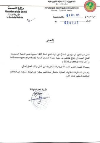 دعت وزارة الصحة الموظفين الراغبين في المشاركة في قرعة الحج لسنة 1447 هجرية ضمن الحصة المخصصة للوزارة إلى إيداع طلباتهم في أجل أقصاه 09 يناير 2026 عبر منصة مديرية المصادر البشرية https://drh.sante.gov.mr/elhaje .