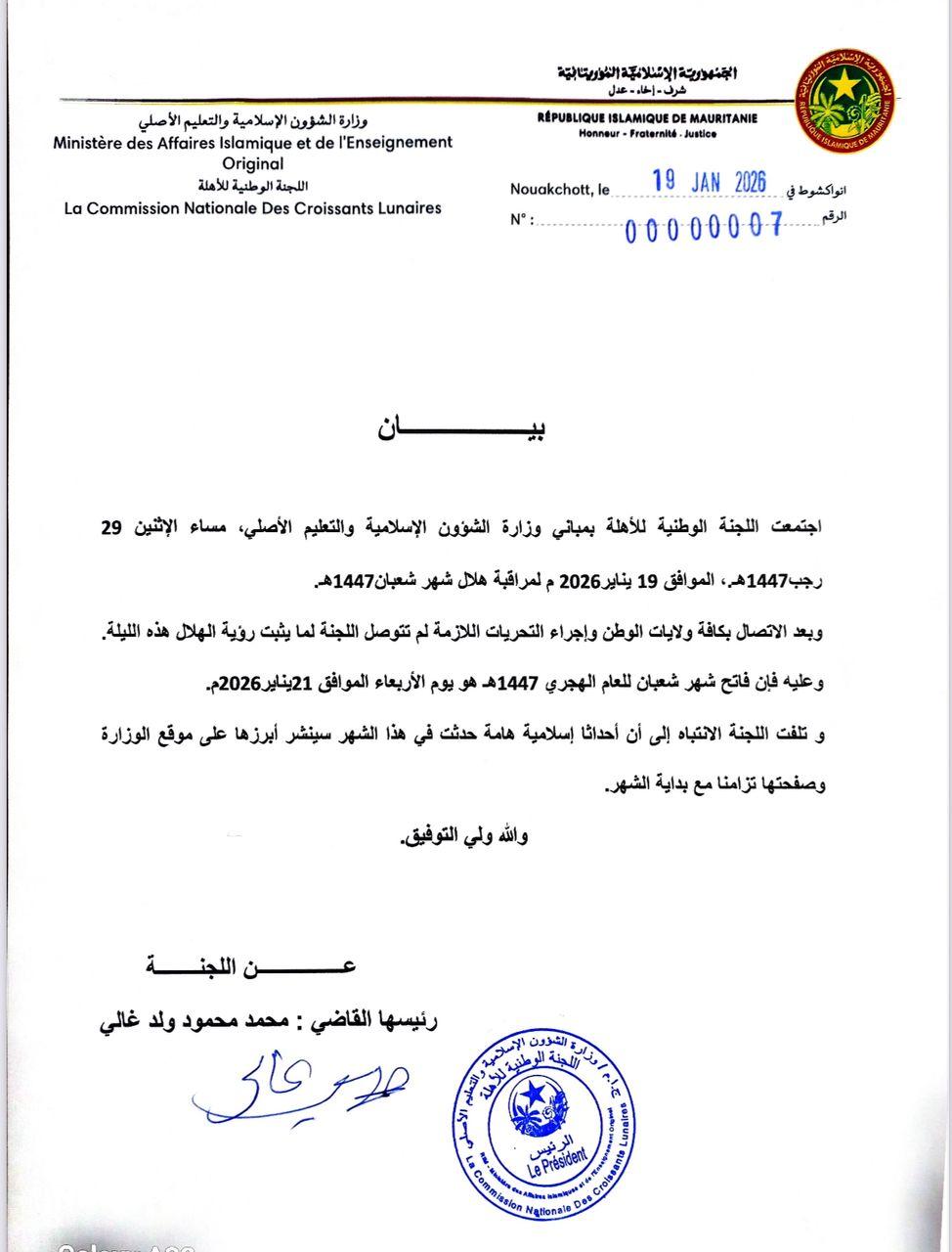 ووقع البيان رئيس اللجنة الوطنية للأهلة، القاضي محمد محمود ولد غالي.