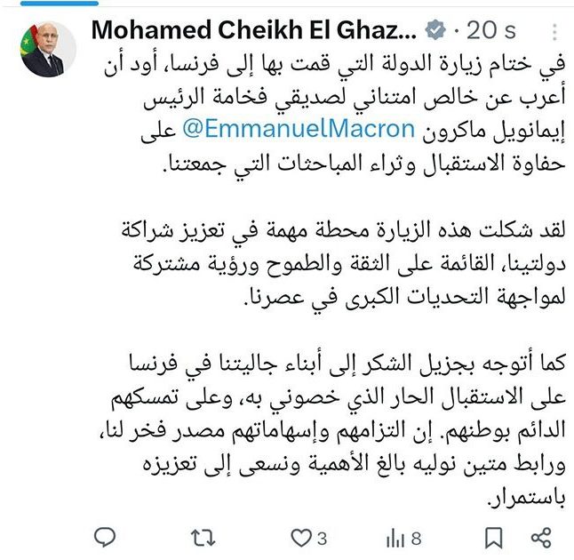 ومثّلت هذه الزيارة محطة مهمة في مسار تعزيز الشراكة بين موريتانيا وفرنسا، على أسس من الثقة والطموح والرؤية المشتركة، بما يخدم مصالح البلدين.
