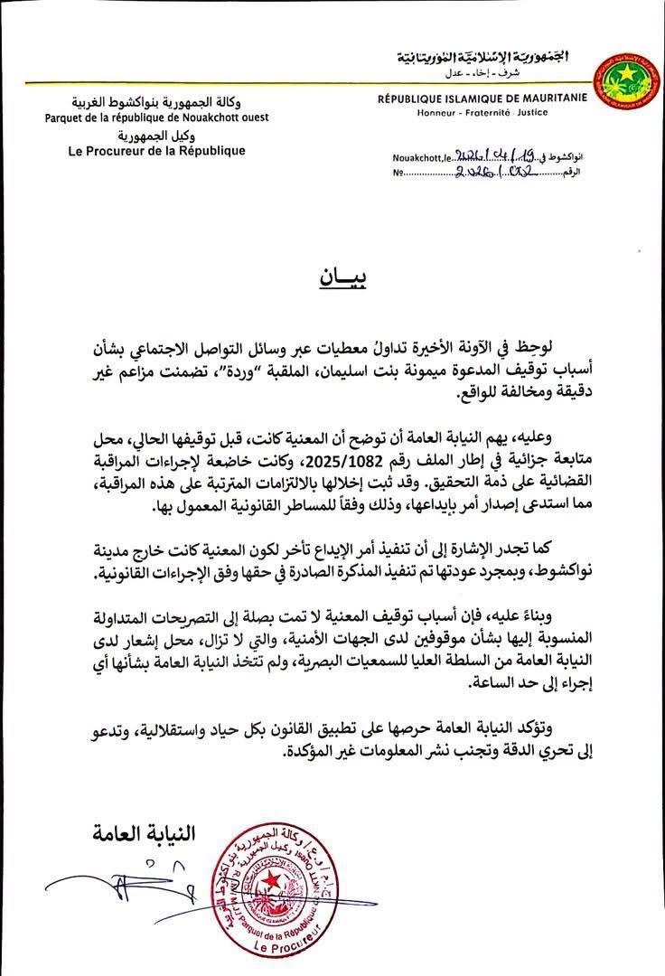 وأضاف البيان أن تنفيذ أمر الإيداع لم يتم فور صدوره بسبب وجود المعنية خارج مدينة نواكشوط، قبل أن ينفذ القرار فور عودتها، بما يتماشى مع المساطر القانونية.